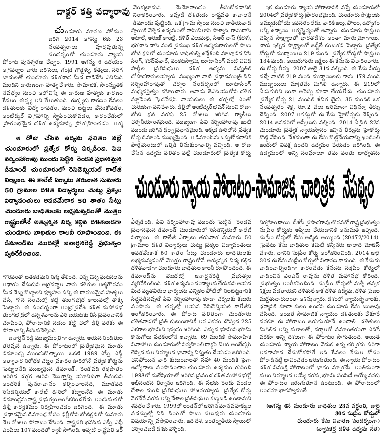 Katti Padmarao is the founder of Dalita Mahasabha that spearheaded the Dalit movement in Andhra Pradesh in the aftermath of killings of Dalits in Karamchedu in coastal Andhra. He has a wide range of writings to his credit. He is the visionary from Coastal Andhra region who welcomed the bifurcation of Andhra Pradesh state.